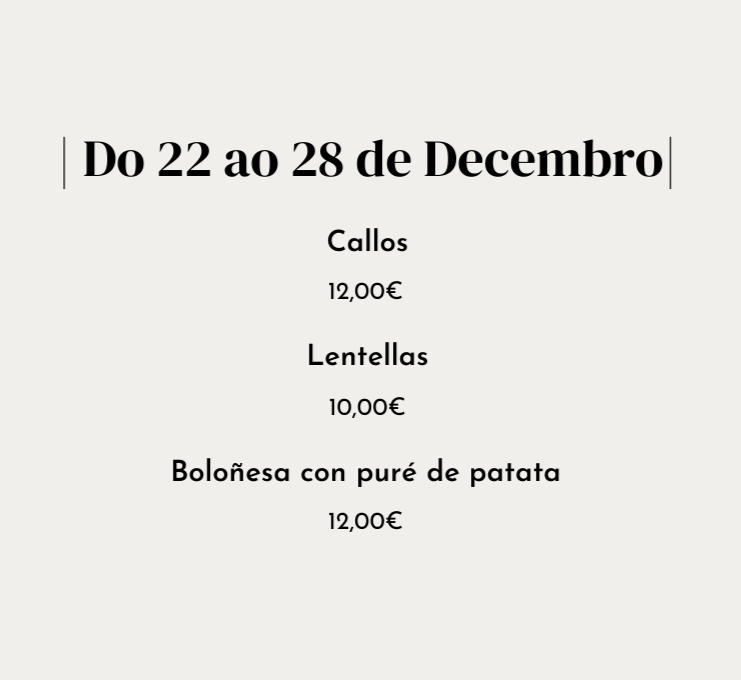 Elaboramos cada semana unha pequena variedade de pratos do día para levar, dispoñibles baixo demanda, chamando ou escribindo por WhatsApp ao número