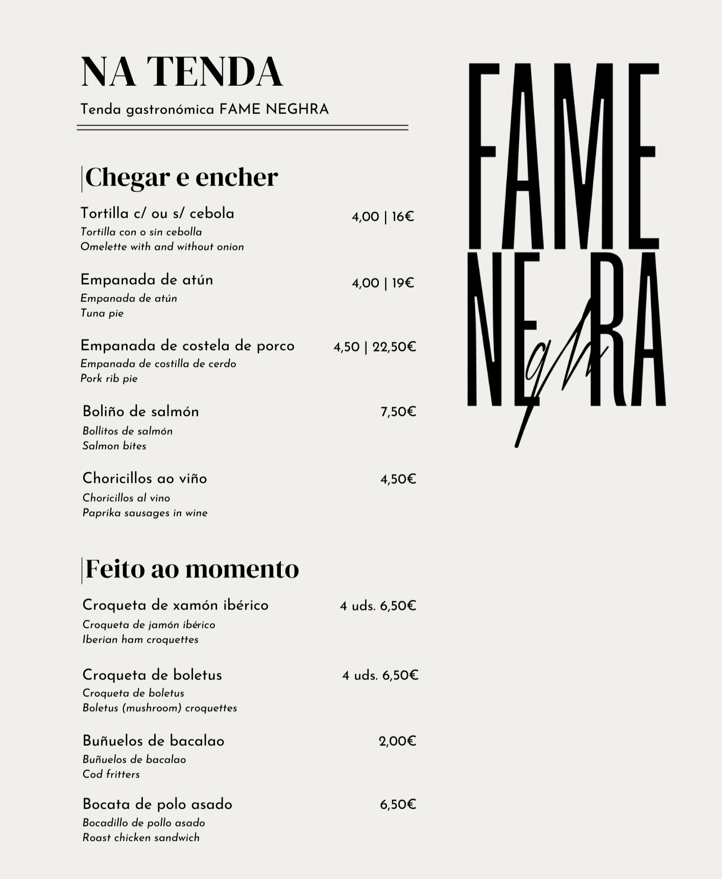 Benvidas/os a Fame Neghra a túa tenda gastronómica en Compostela. Somos un espazo pensado para facerche a vida máis doada.